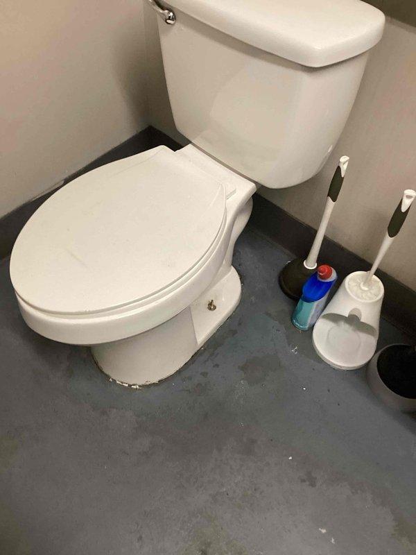 Responded to service call for toilet leakage issue. Upon inspection, found water spots/staining on concrete floor around toilet base. Replaced worn wax ring seal and tightened loose toilet bolts to eliminate leak, then tested for proper function and verified no further leakage.
