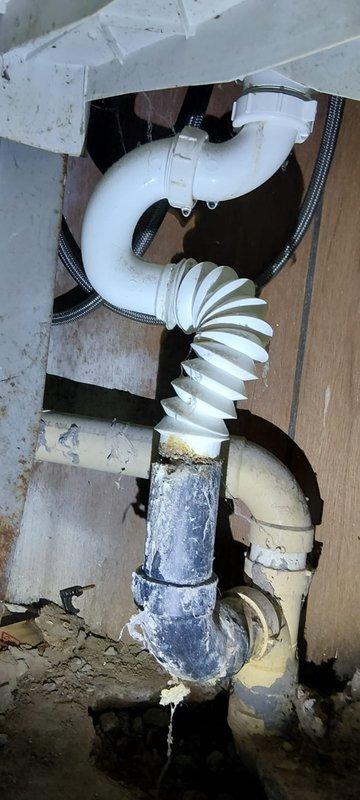 Responded to service call regarding odor emanating from basement drain. Upon inspection, discovered improper drainage assembly with deteriorated components including a non-code compliant accordion-style flexible pipe and corroded metal section showing significant mineral buildup. Replaced damaged components with proper PVC piping and sealed all connections to eliminate sewer gas odor.