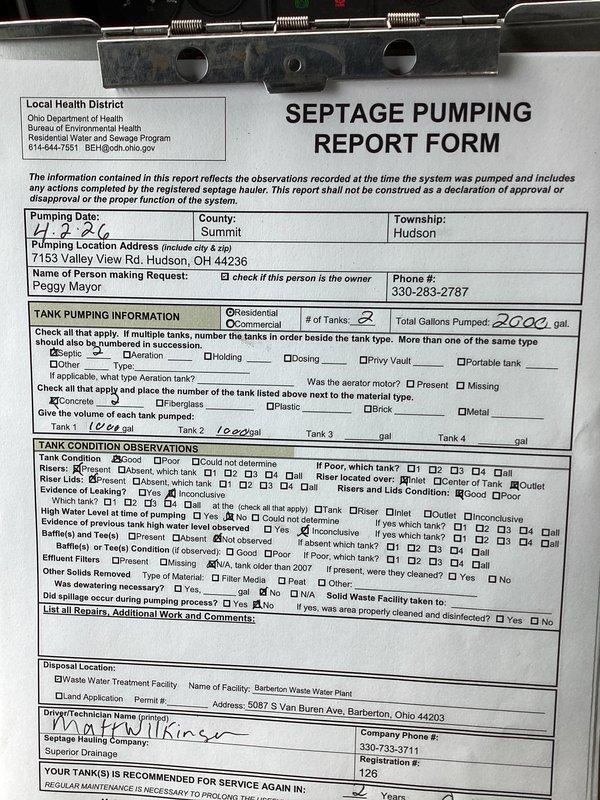 Pumped two residential septic tanks with exposed lids, removing a total of 2,000 gallons of septage (1,000 gallons per tank). Waste was transported and disposed of at the Barberton Waste Water Plant in accordance with local health district regulations, with the system recommended for service again in 2 years.